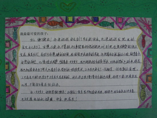 “我最最可爱的孩子,读着你写的话,我真的感到欣慰。从你的话语中,妈妈能感受到你在一天天长大。为了你,妈妈再辛苦,也是值得的……希望你在今后的人生道路上,能够踏实地走好每一步,做个勇敢、自信的男子汉!妈妈永远爱你!”