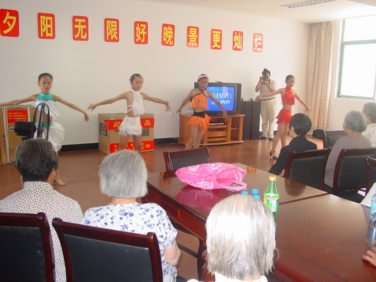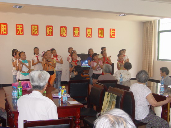 这天下午一点,在学校德育办的组织下,在黄荷芬校长、赵龙、徐振红、曹仁花、包长虹、韩小娟几位老师的带领下,20名热心的同学(五年级各班的学生干部)来到了横山桥省庄村老年公寓。朝气蓬勃的队伍顿时给静谧的院子带来了勃勃生机,他们有的负责打扫卫生,有的陪着老人唠家常,有的给老人捶背、按摩,公寓的爷爷奶奶们一个个乐得合不上嘴。接着,同学们还为老人即兴表演了节目,有女声合唱《乡间小路》、女声独唱《Long long ago》、拉丁舞、古筝独奏……那一刻,爷爷奶奶们沉浸在爱的暖流中。