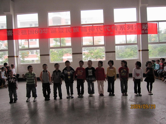 走进九月的校园,秋高气爽,丹桂飘香。9月29日中午十二点整,横山桥中心小学多功能厅内人头攒动,掌声如雷,一首首动听、响亮的儿歌从这里飘飞,一阵阵嘹亮的童音从这里响起:《画祖国》、《这个家庭叫中华》、《我和祖国在一起》、《祖国妈妈》……一次以“喜迎祖国60华诞暨民族精神代代传系列活动”为主题的儿歌朗诵会正在这里如火如荼地进行着。孩子们的爱国心就像一颗颗小小的音符,蹦跳得如此欢畅。一年级(1)班小朋友的诗歌《画祖国》拉开了朗诵会的帷幕,他们的声声表达是那样动情,一板一眼的动作又是那么可爱。作为全场压轴节目《爱祖国》把整个会场推向了高潮。小朋友们感情真挚,声情并茂,表演形式多样,精彩纷呈。抒情的诗歌组成了一曲歌颂祖国的交响乐。这是发自少年儿童内心的呼唤,他们用声音创设了美的氛围,让爱国主义的高尚情操在每个孩子的心田流淌;用他们的童心和真情演绎了对祖国母亲爱的乐章。