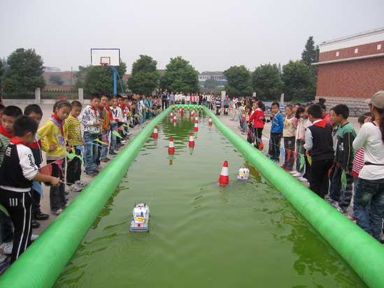 比赛规则是前5个桩绕“S”形前进,后两处用3个桩排在一起的则要绕360度进行,之后的两个桩绕“8”字前进。比赛采用的是秒表计时,用时最短的选手获胜。随着裁判老师一声令下,小选手们个个聚精会神,手势灵巧, 动作麻利。一艘艘“导弹驱逐舰”已整装待发,更加紧张刺激的航行速度赛一触即发,“比赛开始!”裁判老师发出了起航的号令,同学们手中精巧的船模依次出航。快了,慢了,偏离航道了——同学们手舞足蹈,大呼小叫,恨不得亲自代替自己的船模在“海洋”中疾驶,速度赛在紧张激烈的气氛中进行着,同学们的呐喊声、喝彩声响彻校园的上空。最终,潘成蹊、王闻起、沈易等多名选手获胜,欢欣与鼓舞写满了他们红扑扑的笑脸。此次活动带来的深远意义是不言而喻了。