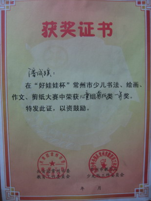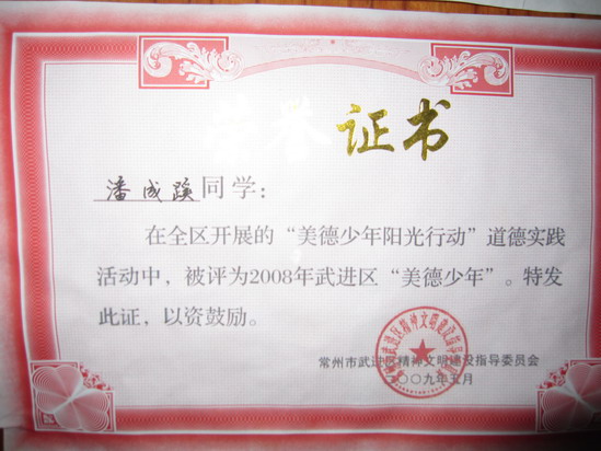 说起他,教过他的老师都会啧啧赞叹。他是一位全面发展的阳光少年。不光热爱学校,尊敬老师,团结同学,而且学习刻苦,善于钻研,成绩优异,是老师得力的小助手,同学们学习的好榜样。年仅9岁的他曾经在校口算比赛中荣获年级第二,在全校乒乓比赛中得男子组第四名,武进区儿童剪纸比赛一等奖。