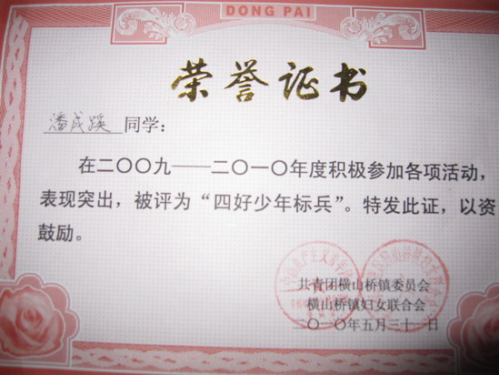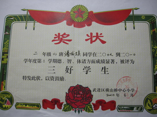 努力成就梦想,坚持就能成功!天道酬勤,他被评为校“三好学生”、镇“优秀少先队员”、镇“四好少年标兵”、区“美德少年”……一路走来,他深深感谢精心哺育他的父母和老师,更感激默默栽培他的土壤——横山桥中心小学。