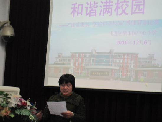 盼望着,盼望着,又盼来了周一,五、六年级、综合、英语、体育办的教师今天终于闪亮登场了!在演讲中,参赛选手们围绕着校园文化、文明用语、师生精神面貌、校园新人新事、共建和谐校园等主题进行演讲,同时利用声情并茂的语言、配以灵活的手势,传颂校园先进典型,倡导校园文明新风。 “爱我横小,从我做起,从点滴做起”! “讲文明、树新风、促和谐”! 一位位参赛选手的精彩演讲,赢得了全体教师的热烈的掌声和欢愉的笑声。瞧,赵菊华老师从学校长期开展“经典诵读”这个角度激情地演说校园的和谐文化;费忆军老师换上笔挺的西服、戴上帅气的领带讲述着他的《和谐横小,心心相印》;杨亚静老师则娓娓道来,温婉细腻地向大家呈现着和谐的办公室文化;就连那人高马大的体育教师卢文祥也用他那粗犷浑厚的嗓音真诚深情地反复表达着“我爱我校”,引来大家的一致的喝彩……比赛高潮迭起,笑声四溢。