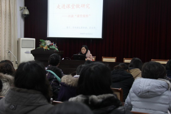 课堂观察:走进课堂做研究 ——记横山桥中心小学校本教研活动 “课堂观察”作为一种全新的教学研究活动,在我校已经尝试了一年多的时间。为了进一步推开这项校本教研活动,教科室决定组织开展一次“课堂观察”总结培训活动,并举行现场“课堂观察”观摩活动。活动分三个层面进行,首先进行实践的总结和理论的培训,然后进行现场观察观摩,最后进行观察结果交流研讨。 活动之一:培训 12月13日下午,教科室主任是宝华结合一年来各学科组实践“课堂观察”的情况,为全体一线老师作了《再谈“课堂观察”》的专题讲座,拉开了“课堂观察”校本教研活动的序幕。 是宝华主任首先总结了各个教研组一年来开展“课堂观察”这一教学研究活动的做法与困惑;接着从理论的层面围绕五个方面的内容阐述了“课堂观察”:听课、评课=课堂观察吗?为什么要进行课堂观察?课堂观察的形式有哪些?课堂观察的基本要求及步骤等。通过举例论述和联系实践,老师们对课堂观察的概念越来越清晰,对课堂观察的形式也越来越熟悉,特别是对现在比较认同的将课堂分为4个纬度,20个视角,68个视点的全息观察很感兴趣,这也为教研组长如何确定主题,选择视角和视点解决了困惑,可以从有效教学的总目标出发,根据自己课堂教学需要解决的问题选择合适的视角、视点。至于“课堂观察”的形式,大家更偏向于“关键问题聚焦观察”和“视频教研精细观察”,一致认为这样的形式更适用于教研组和青蓝共同体开展研究活动。 半个多小时的讲座为一线教师打开了一扇校本研究之窗,尤其对于新教师,课堂观察是新老师们在专业上起步、成长的重要途径和方法。课堂观察绝不仅仅是“观察”的问题,透过“观察”本身,折射出的却是观察者的技术和理论视角。做教育教学的有心人,走进教育教学的真实世界。