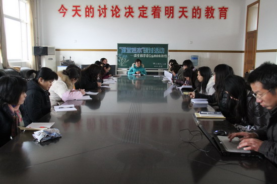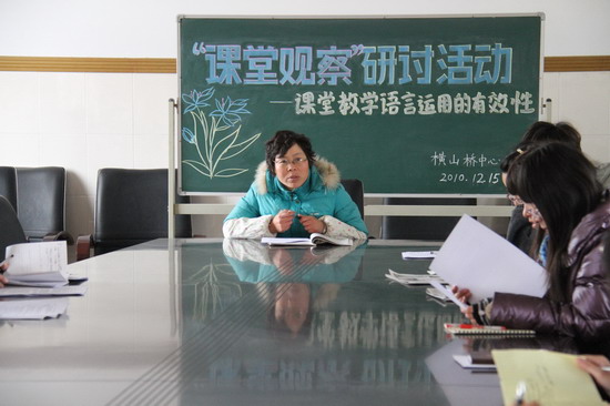 活动之三:研讨 所谓当局者迷,旁观者清。我们教学的时候,常常沉浸在既定的教学目标、过程以及教学效果中,以至于很难发现课堂互动中存在的问题,而作为旁观者的观察者,自然可以清晰地从不同的视角去观察。观察得出的结论可以为教学提供大量的经验和方法。 12月15日下午,在杨清娣副校长的组织下,参与观察的老师和所有的学科组长聚集在小会议室,举行“课堂观察”结果分析交流研讨活动。 首先,执教者张丽华老师对《厄运打不垮的信念》进行了说课,重点谈了自己的教学设计和预期目标的达成情况。然后,观察组的三位组长朱晓红、蒋红莉、是宝华老师分别汇报了观察的结果及分析思考。通过数据的分析和比对,大家围绕主题“教师课堂语言运用的有效性”进行了有理有据的评议,如在提问类型、方式、有效程度;问题设计的可行性;提示语、过渡语、总结语的效果;对学生的评价及学习兴趣的调动等方面都作了真实、可靠、准确、细腻的分析说明,打破了以前评课中的泛泛而谈和温柔,评议更有针对性、目的性,使交流研讨变得更有实际意义。 最后,大家还讨论了观察中的一些困惑:如观察记录工具的运用,对整堂课整体性的把握与分解观察的问题等。杨校长针对大家的困惑,也提出了合理的解决办法,并指出:我们要探索校本化的“课堂观察”的操作程序,要充实“课堂观察”这一教研活动的形式与内容,让被观察者和观察者互利共赢,从而促进学校教师的专业化发展。