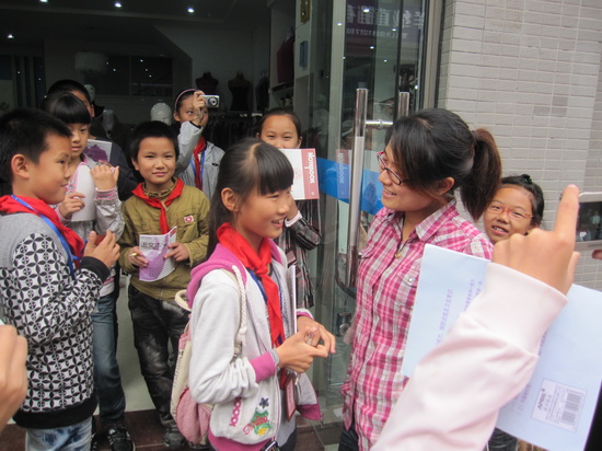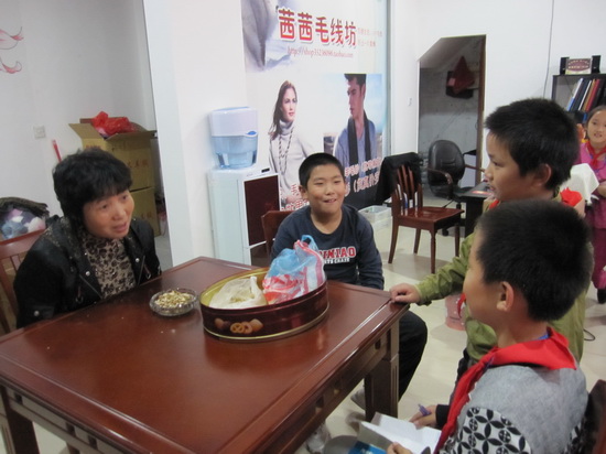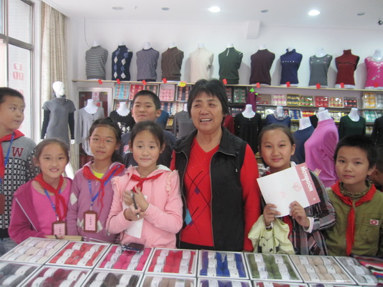 首先,小记者们来到了“茜茜毛线坊”, 发现店里面的毛线品种繁多,色彩鲜艳。大家热情地跟店主打招呼,落落大方地跟店主攀谈起来。“奶奶,请问最近生意好吗?”“你们这些羊绒是从哪里进过来的呢?”“您为什么会想到开羊绒店呢?”“这是什么绒,这么软?”……小记者们的问题一个接着一个,店主耐心细致地一一作答。大家一下子对羊绒的知识有了些许了解,学到了课本上学不到的有关知识。告辞了,为了表达对奶奶的感谢之情,每一位小记者都向奶奶说了几句祝福的话,奶奶听了脸上乐开了花。大家一起合影留念。接着,小记者们又分组分别采访了“泽鸿羊绒店”、“开顺羊绒店”、“佳艺毛线店”等。