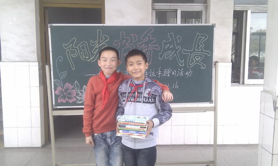 小小的会议桌上转眼便堆满了课外书,眼前的这些书籍都是兄弟学校的伙伴们捐赠的,有翻阅过的童话书、崭新的作文选、珍藏的小说选……,更重要的是,每一本书的扉页都写下了原主人的一番心里话:阳光的小伙伴们,希望这些书能给你们带来欢乐;这本是我最喜欢的书,很高兴能和你们分享;我们是兄弟学校,我们也就像亲兄弟;……这些心理话简单、质朴,却深深打动了阳光孩子的心灵,他们迫不及待地摩挲着书本,似乎从中感受到了书本传递的温暖。