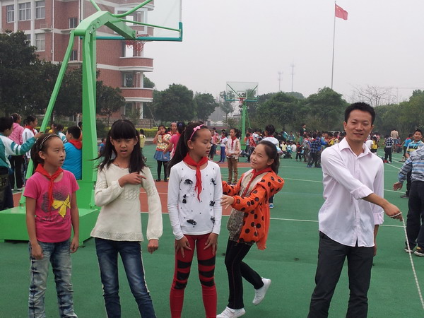 “听那叮铃铃的下课铃声送来十分钟, 来吧,来吧,来吧,大家都来轻松轻松, 让我们那疲劳的眼睛看一看蓝天,让紧张的大脑吹进清风。哦,你好,你好十分钟……”听!大课间的音乐又响起来了,同学们像小鸟一样,拿着各自的活动工具,在各位老师的组织和带领下,开展大课间活动呢!有特别适用于低年级小朋友的皮球、呼啦圈、立定跳远等,还有适合中高年级的篮球、羽毛球、长绳、接力赛、乒乓球、抖空竹等等各种丰富多彩的活动,集锻炼与娱乐一体,拉近了学生间的距离,在活动中,同样让我们的师生关系更加亲密!