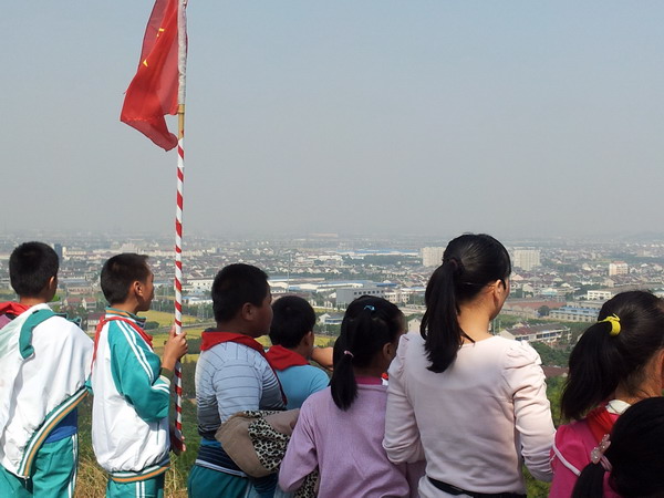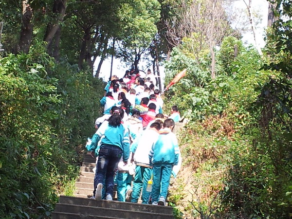 接着大家又在各班老师的带领下顺着山中石梯拾级而上,大家一鼓作气,爬完了288级石梯,来到了芳茂山山顶,迎面凉爽的山风吹来,让人觉得秋光中的横山桥更是别有一番韵味。秋光中,孩子们异常兴奋,有的欢呼雀跃,有的摄影留念,有的展示才艺,有的嬉戏玩耍,还有的极目远眺……啊!家乡横山桥的美景多像一幅五彩斑斓的画卷:不远处沪宁高速公路像绸带飘落在大地,连绵起伏,伸向远方;“阳光山城”、“横山名苑”、“五一新苑”拔地而起,巍然屹立;水稻田里成熟的稻子金灿灿的,秋风拂过,仿佛金色的波涛在翻滚……大家围着,坐着,看着,聊着,笑着,玩着,乐着,享受着暖暖的日光浴,与大自然亲密接触,恍如来到了人间仙境,多开怀啊!