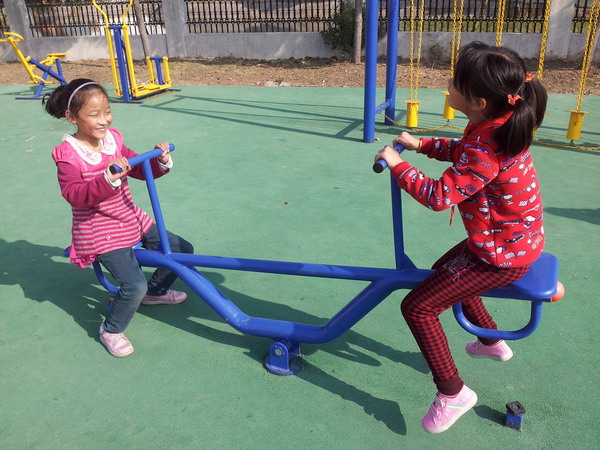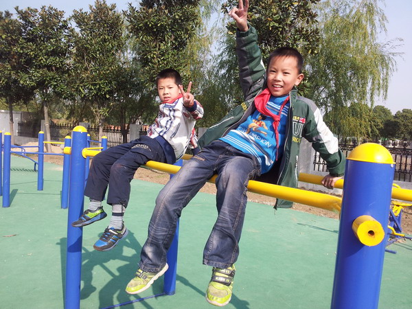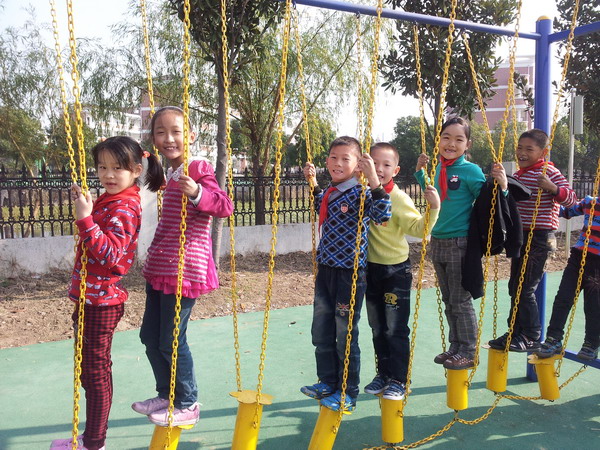 当然操场旁的体育器械大家也是一定要玩一玩的,瞧,大家争先恐后,有的坐上那张可爱的摇摇椅,梦想便随着身子一起飞翔;有的爬上那高高的单杠,真有“欲穷千里目,更上一层楼”的感觉;还有的拉上铁环,心花顿时就怒放开来;最有趣的是走“吊桥”了,大家你前我后,享受着不一般的感觉……