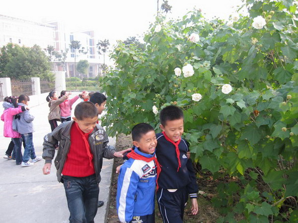 瞧,操场一隅的变色木芙蓉在阳光下开出了惹人喜爱的花朵,一下子就吸引了孩子们亮晶晶的眼球,一阵风吹过,变色木芙蓉花摇曳着婀娜的身姿,仿佛在向大家点头致意呢!孩子们再也按捺不住激动的心情,有的不由自主地闻闻花香,有的则在变色木芙蓉下玩起了“老鹰捉小鸡”的游戏,欢声笑语顿时在操场上空荡漾开来,张张小脸像变色木芙蓉花一样灿烂可爱……