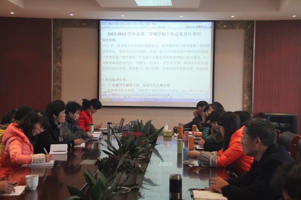 会议由周月萍校长主持。周校长首先感谢大家在过去一年为学校发展作出的不懈努力,并介绍了本期学校主要工作及思路,希望大家尽心、尽力、尽职、尽责,开展好本职工作、本部门工作,做好开学工作中的收费、安全、卫生工作,特别提出要每位行政人员心中要有“愿景”,工作要在继承的基础上改革和创新。要认真对照自己的岗位责任,规划好自己,紧紧围绕“督导评估”这一中心工作,制定出一个可行的个人成长目标和工作目标,不断进步。周校长的讲话引起了与会人员的强烈共鸣。随后,周校长针对德育、教学与教科研工作结合实际作了详细部署,大家均表示要严格执行,尽早准备,及时落实。