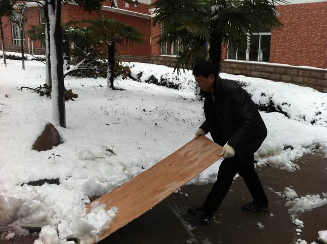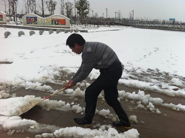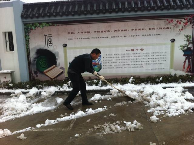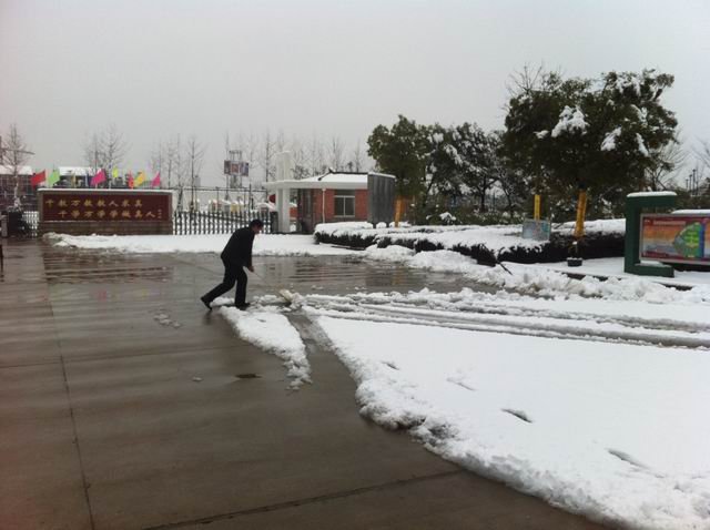 然而新学期就在眼前,雪后难行,一场紧急通知减缓了各学校开学的步伐。尽管如此,横山桥中心小学的领导们仍旧一大早踩着厚厚的积雪赶到了学校。为了在新学期给孩子们创造整洁、平安的校园环境,周校长带领总务处的几位同志一马当先,大家冒着严寒齐动手,铲雪除雪工作干得热火朝天。在领导和老师们的感召下,保安师傅来了、花匠工人来了、食堂阿姨来了……铁锹挥舞,雪花散落,一片片的积雪刹那间就堆成了座座小山。寒风呼呼地刮着,雪花冷冷地飘着,可老师们的身上心里却都是暖暖的。