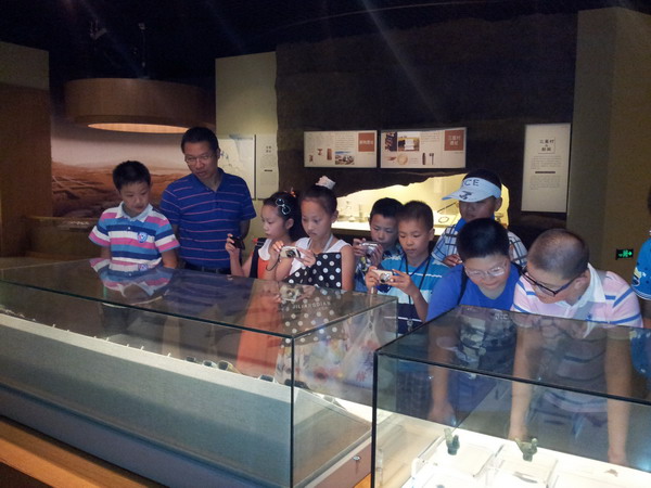 上午9时,20余名少先队员怀着满腔的热情,在学校蒋校长、赵老师、徐老师和曹老师的带领下,来到了常州博物馆。队员们一跨进博物馆,就被这采用现代建筑理念设计的博物馆深深地吸引了。这是一个集收藏、研究、陈列与展览于一体的地方综合性博物馆。队员们兴致很浓,热情很高,组织有序。他们跟随着解说员,参观了史前常州、延陵季子、齐梁故里、中吴要辅、儒风尉然五大版块,队员们时不时在馆内各陈列处驻足浏览,细读文字,十分投入,收获颇多。特别是二楼《龙腾中吴——常州历史文化陈列》真实活灵地再现了圩墩人的生活场景和齐梁帝王之家的华美陈设;三楼的《神奇的自然,美丽的家园》更把队员们带进了一个绚丽多姿的动物世界。这里除了栩栩如生的动物标本,还有各类昆虫的电动模型,这个集知识与趣味于一体的展厅和丰富的观藏激起了大家浓厚的学习兴趣,同时也感叹制作人员付出的辛勤和代价之大。