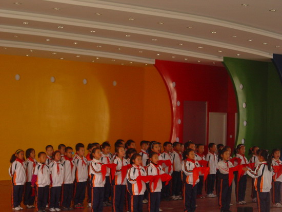 全校1—6年级43个班级的同学纷纷登台,他们以饱满的情绪、嘹亮的歌声,合唱了《歌唱祖国》、《中国少年先锋队队歌》、《五星红旗》、《中华各族儿童幸福的家》等脍炙人口的不朽红色经典歌曲。