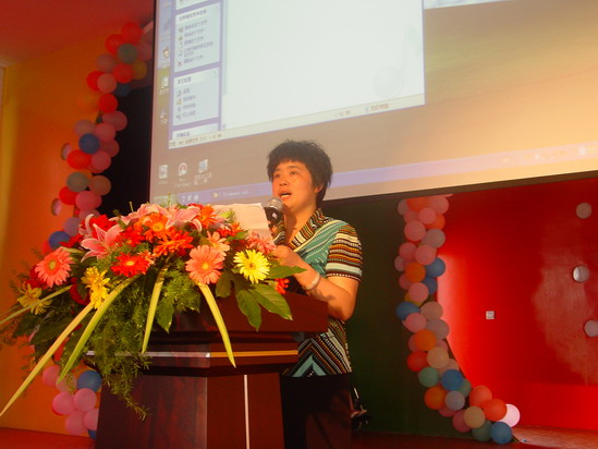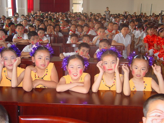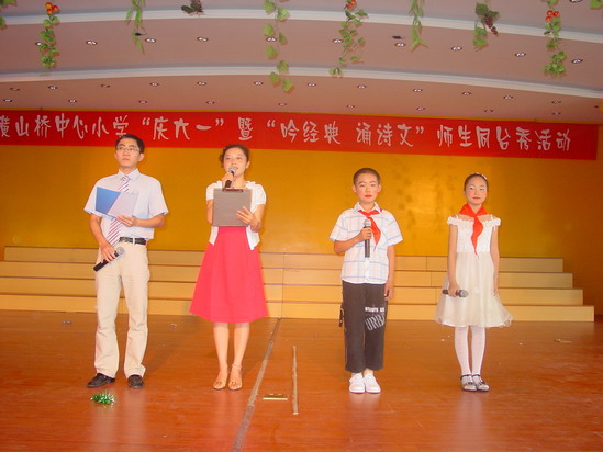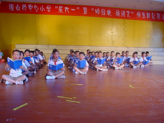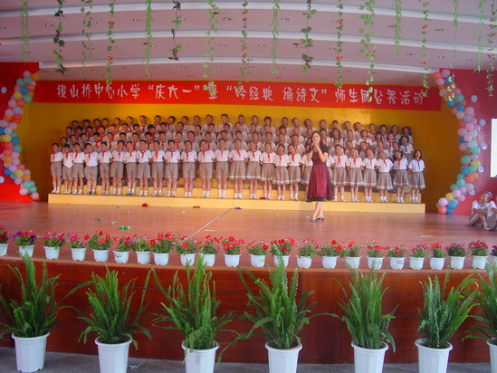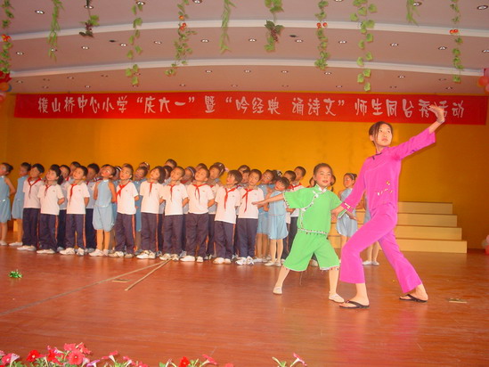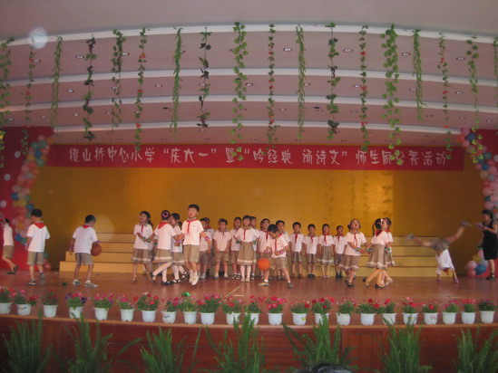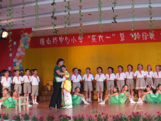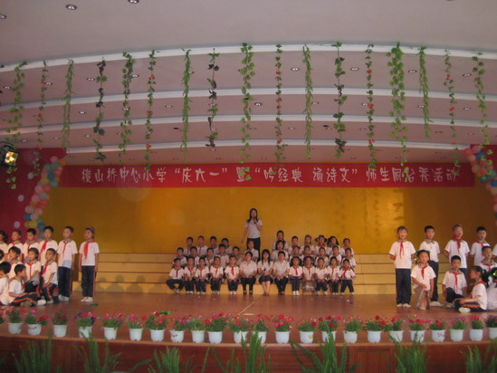 大舞台:为了让每一位学生能欢度六一佳节,在童年的记忆手册中留下最绚烂的一抹色彩,我们摒弃了以往女生称霸“舞林”的文娱表演形式,请每位学生都自信地踏上美丽的舞台,或吟诗,或诵经,或高歌,或曼舞……“让每个孩子在自己的节日里绽放最可爱的笑容”是我们策划本次活动的宗旨之一。而且,舞台上还走来了特殊的嘉宾——语文老师,师唱生随,呈现出了一派其乐融融、师爱无痕的胜景。最为感动的是当三(6)班的黄荷芬校长边推着坐在轮椅上的陈晶津同学,边吟诵着《春晓》走到舞台中央时,顿时掌声四起!