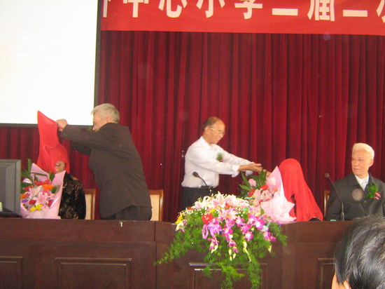 最激动人心的要数第三项议程——庆金婚、钻石婚典礼了。花团锦簇,笑意融融,丁新泽和贾浓英迎来了五十年的金婚庆典;菊花争艳,松鹤延年,杨政和陈惠琴迎来了六十年的钻石婚庆典。在庆典上,“新郎”为“新娘”揭开了红盖头,引得大家捧腹大笑,掌声经久不息。最后,我们的退教协会会长魏梓金致庆婚典致辞。幽默风趣的祝词,把在场的每一位老师都吸引住了。庆祝活动的欢乐场面深深地留在了大家的记忆里。
