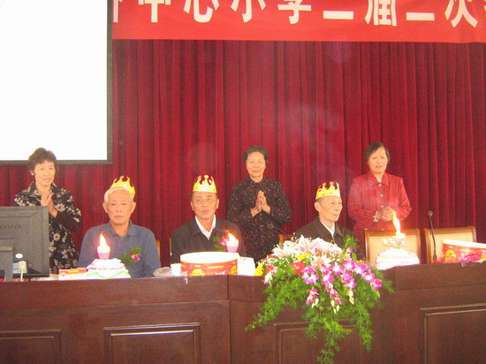 在闪耀的烛光中,我们迎来了活动的第二个议程——祝寿活动。七十岁寿星——徐生海、杨乃良、邵龙娣,八十岁寿星——包韵秋,九十岁寿星——徐维城一一上座。几位退休女教师为寿星们戴上了鲜花和“寿星帽”,周主任还为寿星们献上了精美的蛋糕,当蜡烛点燃,美妙的的乐曲响起的时候,大家都情不自禁地为他们唱起了祝寿歌,此时,周校长在热烈的掌声中致祝寿辞!向寿星们献上一份美好的祝愿。