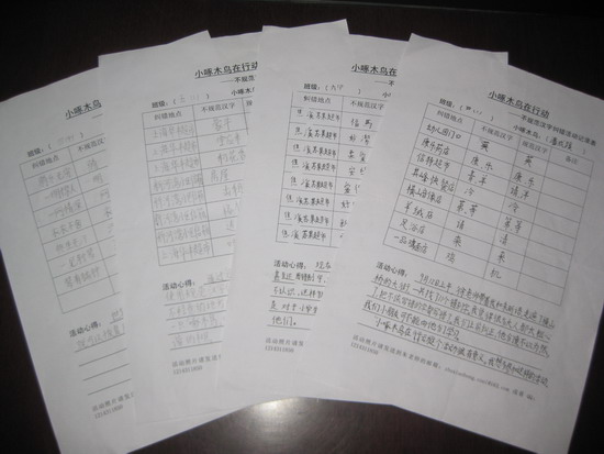 小记者们扛着相机、带着纸笔,深入社区、街道、村庄、公共场所、商店等地,用一双双“火眼金睛”去寻找夹杂其间的形形色色的不规范汉字,并一一做好记录。真是不查不知道,一查吓一跳,活跃在大街小巷的“牛皮癣”广告是错别字、二简字最泛滥的地方,小型的超市里店主自制的货牌多用二简字书写,还有家乡闹市区的招牌广告上有频现繁体字……看来我们身边确实还存在着滥用繁体字、乱造简体字、随意写错别字的陋习。小啄木鸟们都觉得推普行动势在必行且任重道远!