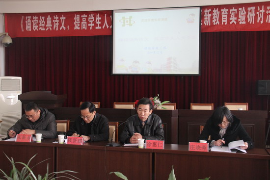 11:00,学校大会议室里座无虚席,课题研究现场结题的鉴定仪式隆重举行。在教研室徐主任的主持下,朱晓红老师向全体领导专家和课题组老师阐述了我课题的研究报告,洋洋洒洒近两万字的报告,丰富多彩的40张PPT,向大家证实了三年来课题组师生走过的虔诚坚实的“经典行动之旅”。四位教科研专家一致欣喜地看到我们的区级课题研究能如此实实在在,红红火火,在区内实属鲜有,深受感染,倍加感动。钱主任用“行动实、思考深、总结精”这九个字高度评价了我课题的研究价值,认为这是一个很高水平的实践项目,成果已远远大于研究预期,行动已超越诵读经典的范畴,真正关注到了学生素质的全面发展,课题研究已渗透到了学校教育的整个领域。徐主任则表示本课题研究目标明确、思路清晰、内容实在、过程扎实,成果丰硕。专家组认为在每一个展示现场都能充分感受到师生在课题研究中成长的快乐,人文素养的提高,极力建议学校积极推广研究成果,并在更高的平台上继续深入研究。