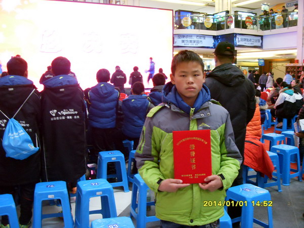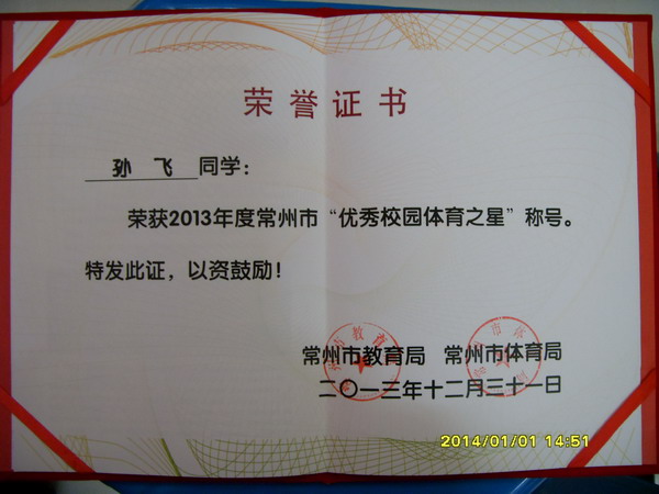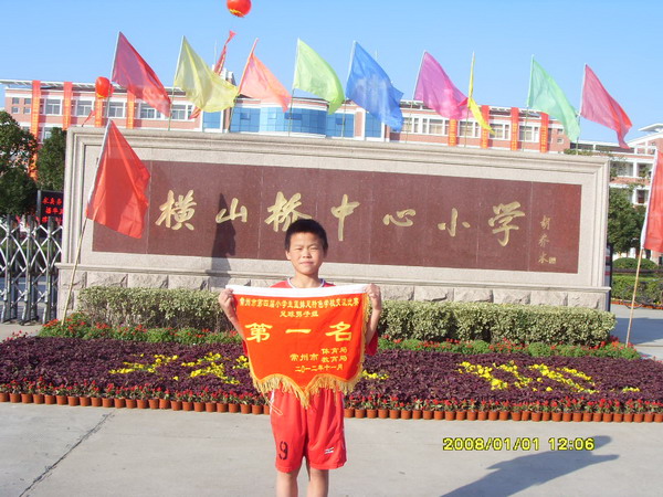 2014年元旦下午,在暖暖的冬日阳光下,“常州校园体育之星”颁奖典礼在红星美凯龙家世界举行。常州市人民政府王成斌副市长、常州市教育局丁伟明局长、常州市体育局朱海山局长、常州市教育局常仁飞、王定新副局长、常州市体育局李晓华副局长等领导参加了本次颁奖典礼,并为荣获“校园体育之星”的同学们颁奖。横山桥中心小学足球队优秀队员孙飞同学被评为优秀“常州校园体育之星”,参加了此次颁奖典礼。