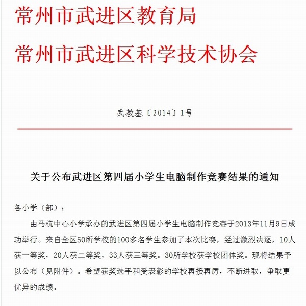 武进区第四届小学生电脑制作竞赛于2013年11月9日举行,全区50所学校的100多名学生参加了本次比赛,经过激烈决逐,10人获一等奖,20人获二等奖,33人获三等奖。30所学校获学校团体奖。我校六1班殷驰、顾晨珂同学喜获一、二等奖,赵龙、宋莉萍老师获优秀辅导教师奖。感谢两位同学和两位辅导老师的辛勤努力,为学校争得荣誉,感谢六1班班主任和任课老师的大力支持,谢谢你们!