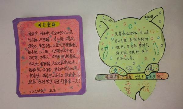 假期的安全很重要,大队部组织了“安全童谣大家编”活动。一、二年级的队员在家长的指导下,编1-2句关于安全方面的警示语,语言简练,琅琅上口;三——六年级的队员与家长一起合编关于安全方面的童谣,将创作的童谣写在卡纸上,并起个好听的名字,开学参加“安全童谣大奖赛”。