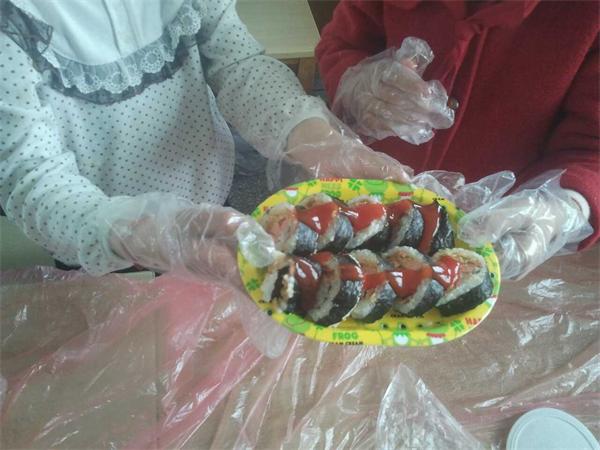 瞧,孩子们齐聚一堂,纷纷拿出了事先准备好的制作寿司的竹帘、保鲜膜以及各种食材,如海苔、肉松、火腿、胡萝卜以及黄瓜,还有调配味道的番茄酱、色拉酱等。为了确保食品卫生安全,孩子们个个自觉地戴上了一次性手套。呀!好香啊?阵阵糯米香味扑鼻而来,原来上课的老师已经端来了煮熟的寿司主材料——香喷喷的糯米饭。