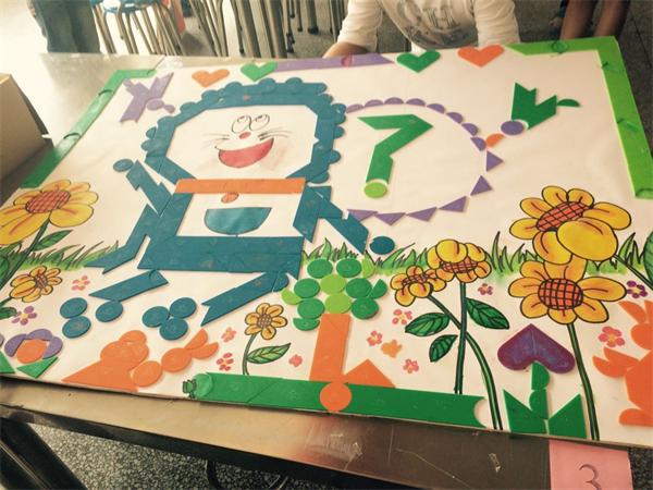 3、陷入瓶颈,积极寻求外援。在组合图案最初,张涛老师带领学生孤军奋战,虽然图案符合数学组合规律,但不够美观,创新力不够,效果不理想。在进度缓慢时,张老师意识到设计的重要,寻求外援,邀请美术办的樊里香、胡庄等老师加入。在美术老师的设计下,七巧板图案的艺术性、可观性大大加强,增加了比赛胜出的几率。