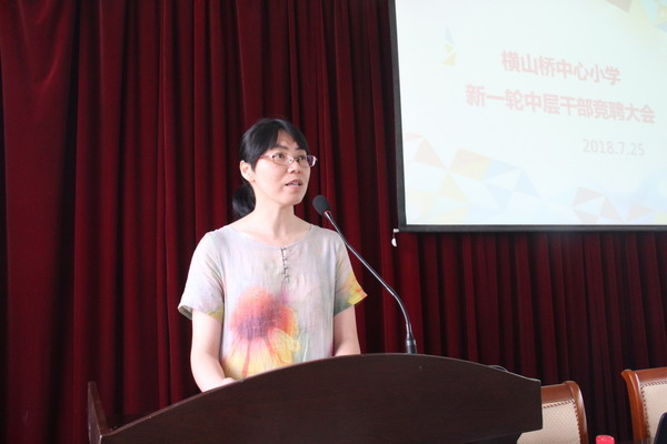 为进一步加强学校中层干部队伍建设,加大干部选拔的民主性,建立健全干部能上能下、竞争择优、充满活力、有效激励的用人机制,建设一支协调高效的中层干部队伍,更好发挥中层干部在学校管理中的积极作用,提高学校管理的质量和效率,促使学校各项工作有序发展,根据区教育局《关于深化干部人事制度改革进一步加强学校中层干部队伍建设的指导意见(修订)》文件,结合学校实际,2018年7月25日上午,横山桥中心小学举行了新一轮“中层干部岗位竞聘”活动。