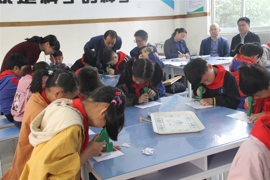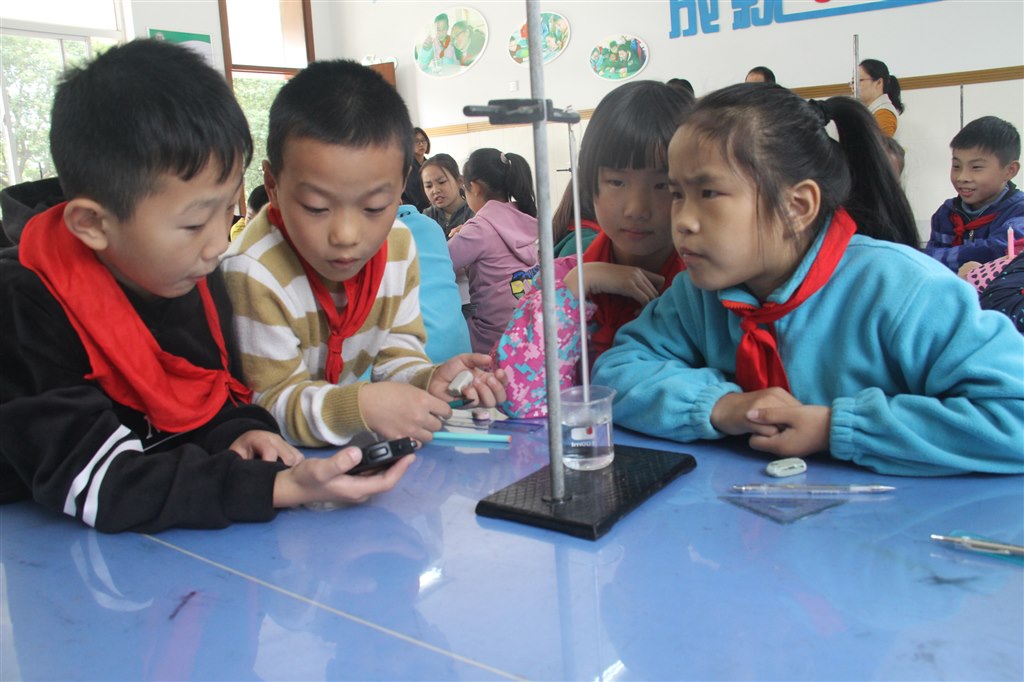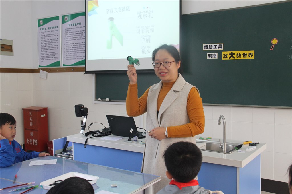 调研组成员首先聆听了两节课:殷霙老师执教《借助工具观察》,这是新增一年级科学教材中的一课。殷老师激发同学们探索放大世界的兴趣,在教学中循序渐进地指导学生使用放大镜和手持显微镜观察。学生在观察手指指腹和衣服等实验中,感受延伸感官功能的乐趣。江建君老师执教《观察水》,诗意的导入将美感融入科学,他带领学生以水为主体,使用看、闻、尝的方法,了解水,通过趣味实验“运水”,进一步感受水的特质。